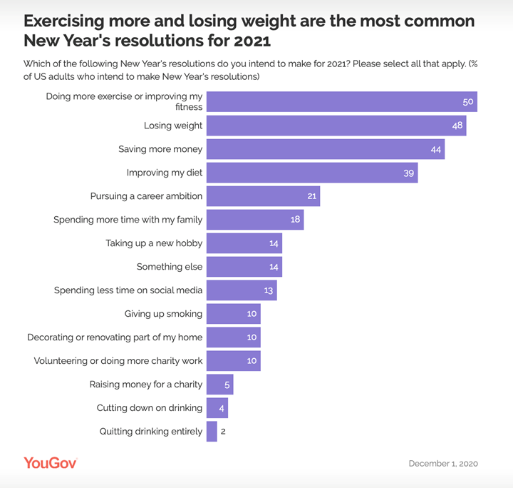 The top resolutions for 2021, in fact, are related to getting fit and weight loss. The other most common resolutions include increased motivation to save money or climb the career ladder, spending time with family, and getting healthier.