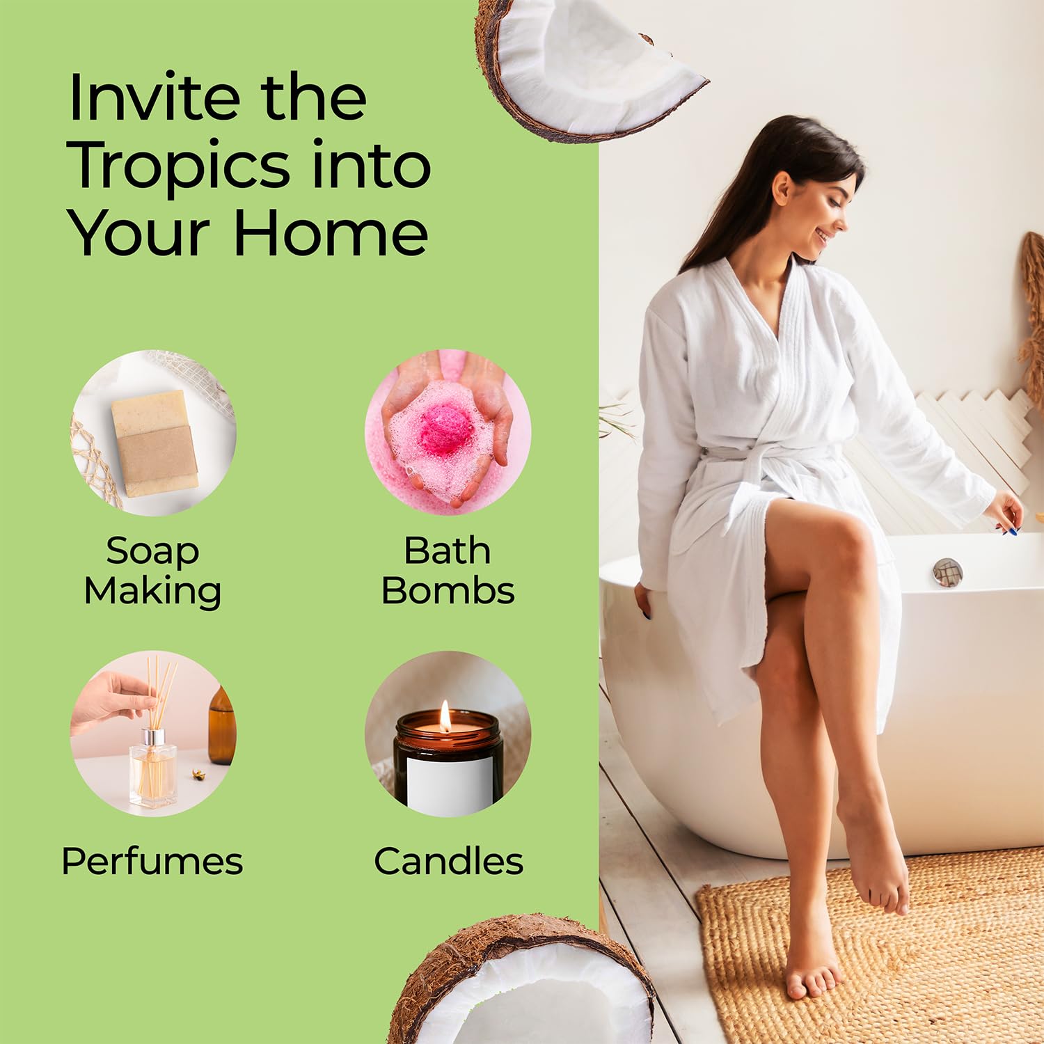 - Handmade Gifts – Improve your DIY projects with the enticing scent of coconut in the air. Our fragrance oil makes the perfect gift. You can even make perfume. Use in skincare recipes or create a tropical island atmosphere in your home.