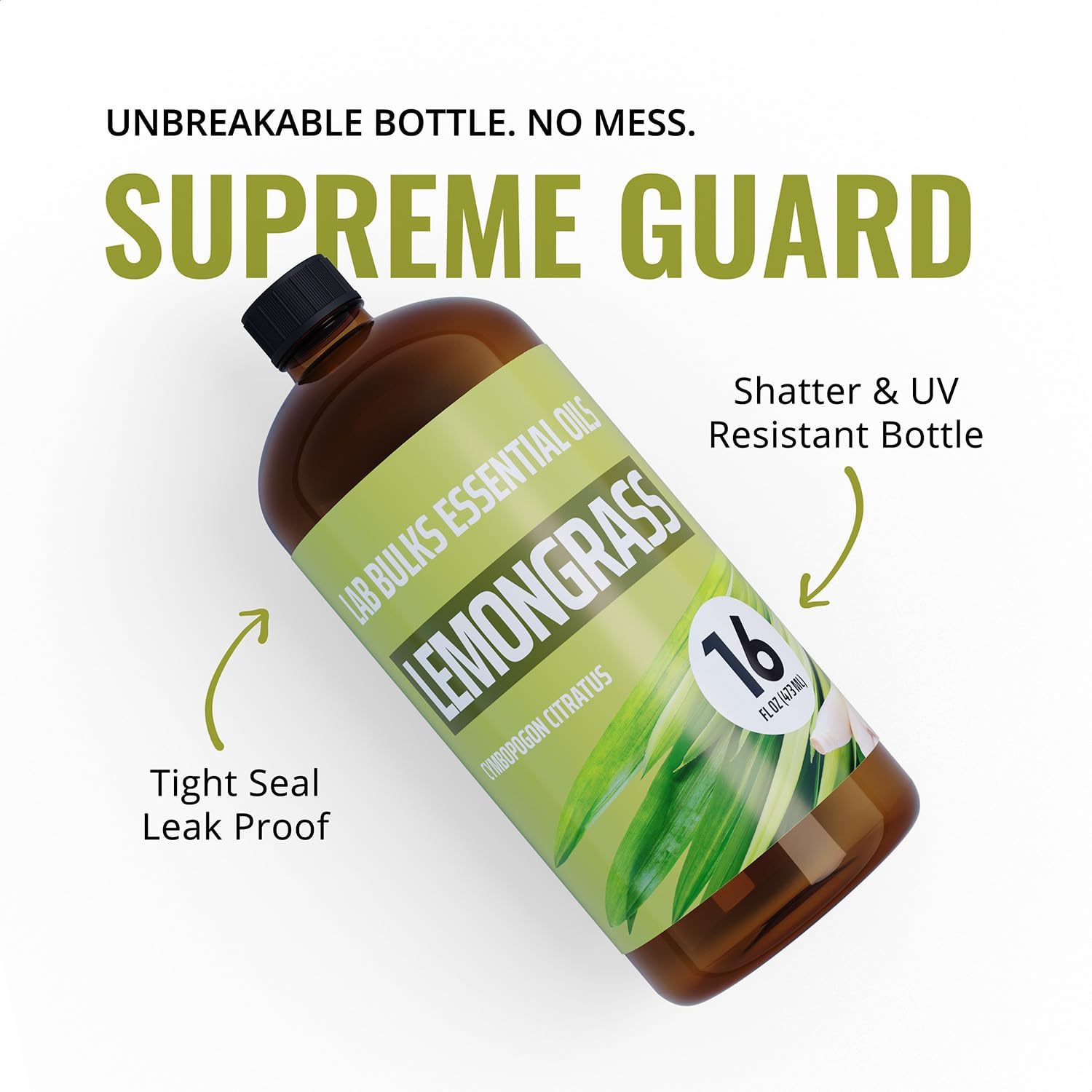 Lab Bulks Lemongrass Essential Oil comes in a 16 fl oz amber bottle, delivering a fresh, citrus-herbal aroma perfect for diffusers, candles, room sprays, and DIY home projects. This versatile bulk oil blends effortlessly with lavender, peppermint, eucalyptus, tea tree, or rosemary oils for custom scents. Ideal for soaps, bath products, hair care, and home fragrances, it is steam distilled and packaged in a UV-resistant bottle to preserve quality and freshness, making it a reliable choice for aromatherapy and crafting.