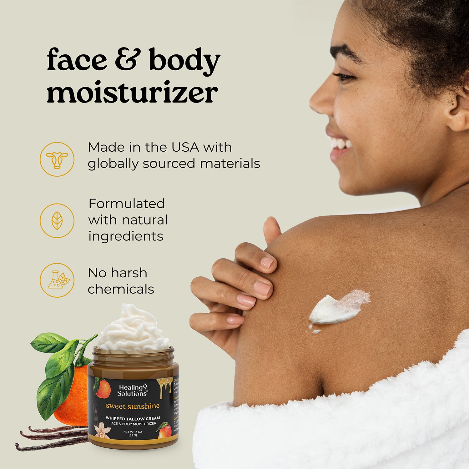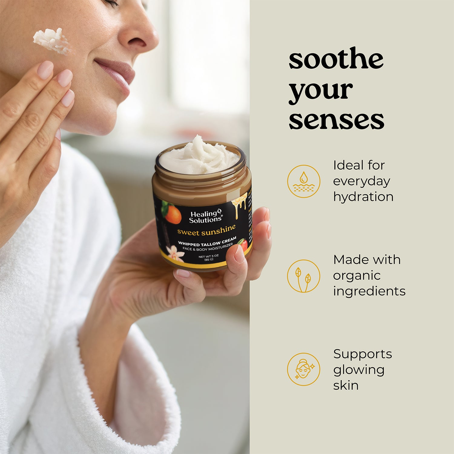 - Whipped Tallow Moisturizer with Mango, Orange & Vanilla Aroma: Sweet Sunshine by Healing Solutions is a fruity scented whipped tallow balm crafted with 100% grass-fed, grass-finished suet beef tallow. Its light, airy texture absorbs smoothly into skin, while a vibrant, juicy blend of mango, sweet orange, and warm vanilla delivers soft hydration without a greasy finish—ideal for dry, rough, or depleted skin.