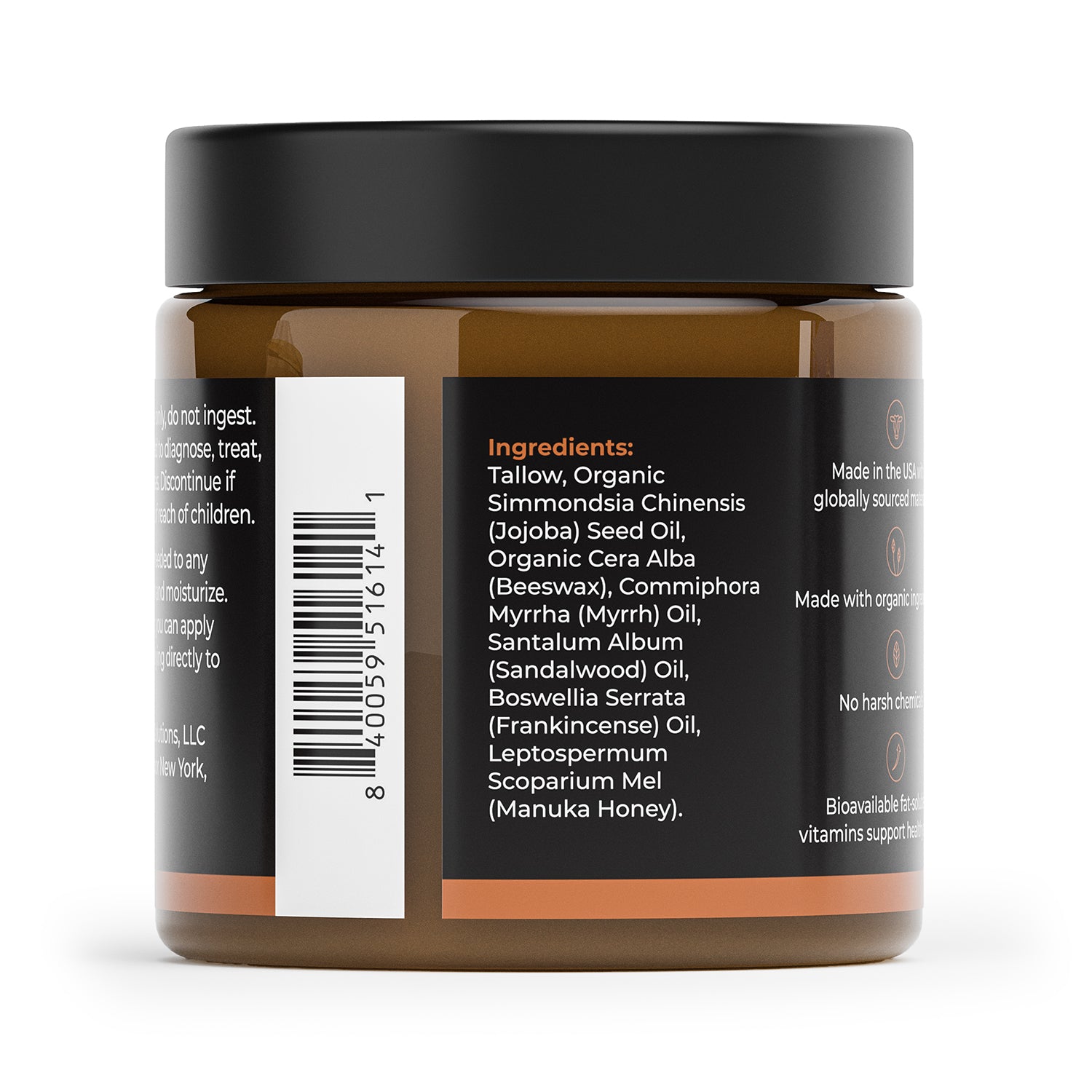 - Clean Ingredients, No Harsh Additives: Our formula centers on four primary ingredients—grass-fed beef tallow, organic jojoba seed oil, organic beeswax, and manuka honey—scented only with pure essential oils. Free from parabens, sulfates, phthalates, petroleum, and synthetic fragrances. Real tallow melts above 95 °F—if soft, refrigerate for 15–20 minutes. Slight variations in color or aroma may occur between batches, reflecting the natural quality of our ingredients.